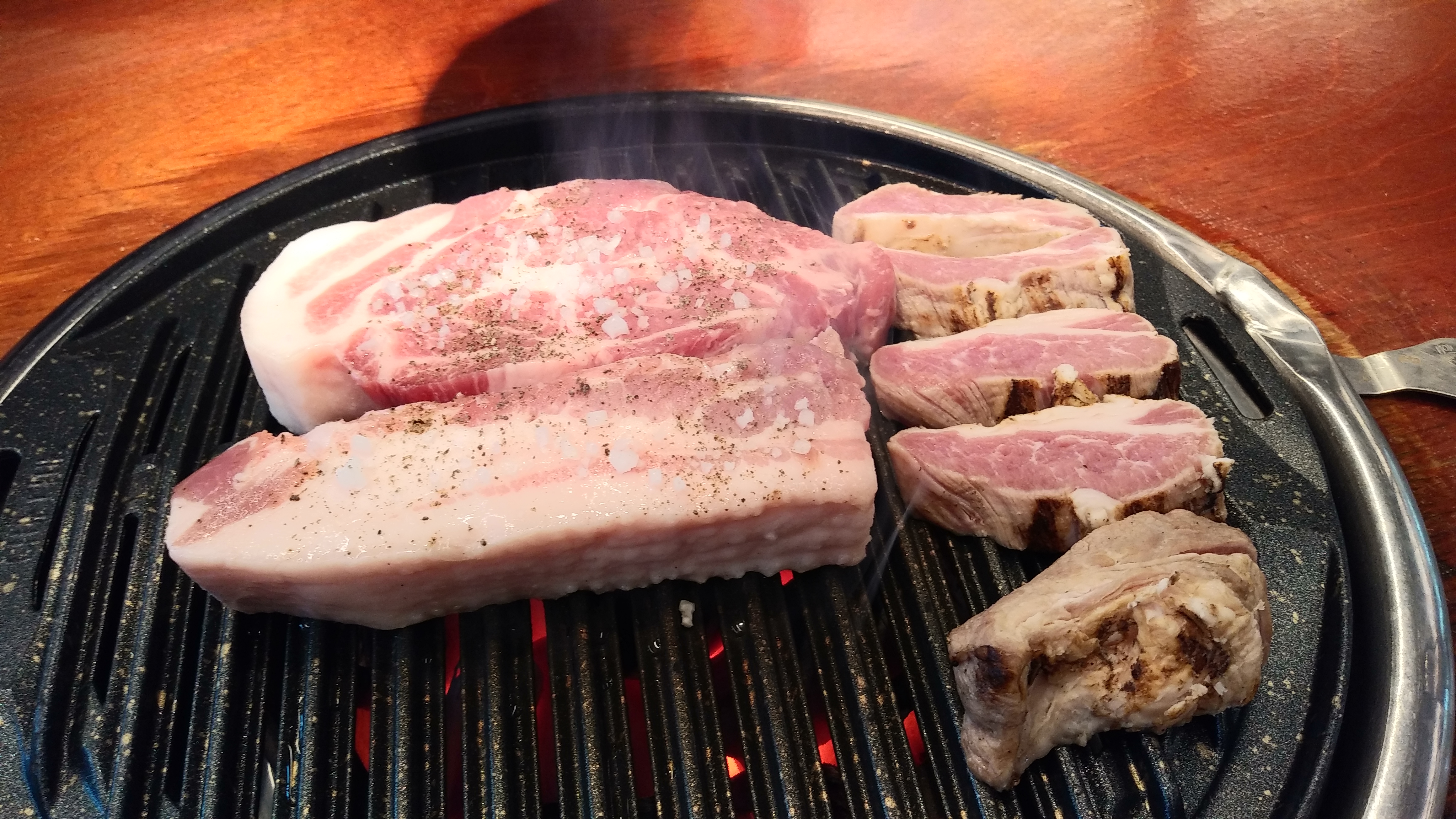 크~ 고기가 다 구워질 즈음 백김치를 올려 바닥에 깔고 고기를 올려주십니다ㅎㅎㅎㅎ근데 직원분께서 고기를 쪼끔 더 잘 구우시면 좋을거같아요ㅋㅋㅋ 덜익은거 있어서 내려서 데워가면서 먹었답니다ㅋㅋ